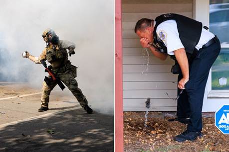 A federal immigration agent throws a tear gas canister at protesters on Oct. 14 at 105th Street and Avenue N in East Side. A Chicago police supervisor who did not have a gas mask washes the irritant from his eyes. (Credit: Sun-Times file photos)